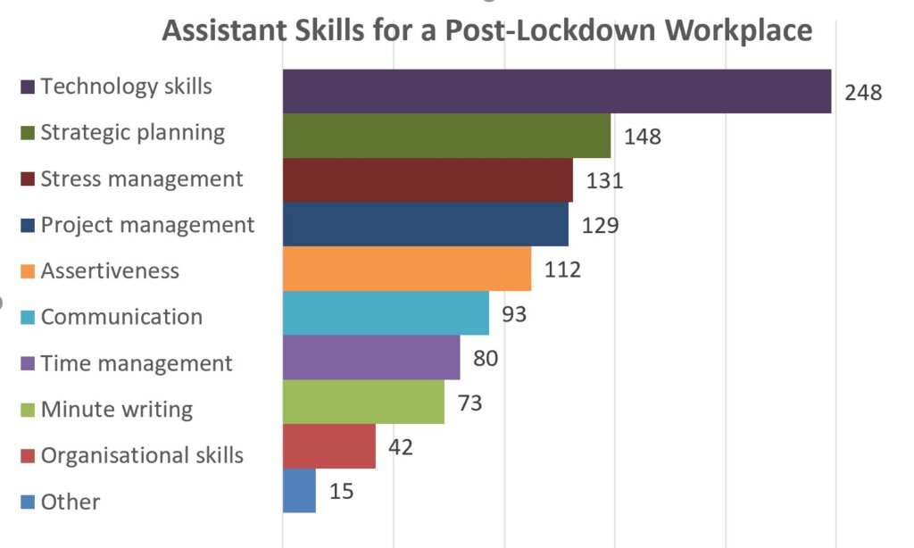 Time management, minute-taking and organisational skills were also mentioned, as Assistants face the negative effects of the hybrid working or WFH, i.e., many more virtual meetings, increased workload, and working longer hours.